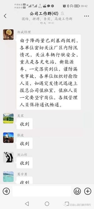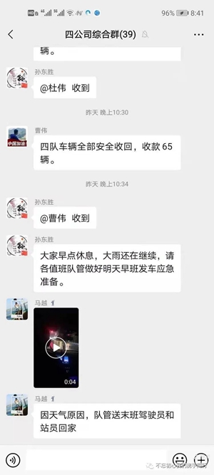 一是信息共享??偣就ㄟ^(guò)微信群、車(chē)內(nèi)監(jiān)控、GPS定位等手段,及時(shí)將線(xiàn)路運(yùn)行情況、危險(xiǎn)路段道路積水情況、場(chǎng)站排水情況等信息進(jìn)行共享聯(lián)動(dòng),以確保及時(shí)準(zhǔn)確下達(dá)工作指令。