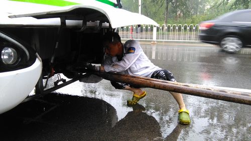 12時30分,207路車在行至開平路段時出現(xiàn)故障。機務隊長張繼民立即開著拖車前往現(xiàn)場,不料返回途中拖車也壞了,得知情況的隊長立即與修理車間聯(lián)系,又派出安全員孫濤、張利明和修理工王金偉火速趕赴現(xiàn)場冒雨搶修,直至晚上六點多,故障車和拖車才順利返回車場,而參與搶修的幾名工作人員早已經(jīng)全身濕透。