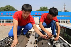 在陽光暴曬下,修理工們的額頭上滲出細密的汗珠,沿著臉頰往下滴。而我站在他們身邊早已大汗淋漓,有些體力不支。“你們這工作真是多重‘烤驗’,室外的高溫就讓人汗流浹背。這發(fā)動機能有100℃,撲面的熱氣更讓人呼吸不暢。還有排氣管的熱風,一吹到腿上皮膚都燒著痛。”修理工笑著擺了擺手:“加冷媒的工作算是輕松的,要是修空調冷凝器,就必須爬到車頂,頭頂著烈日,腳下是發(fā)燙的空調冷凝器,堪比烤‘鐵板燒’、蒸‘桑拿浴’,等修理完感覺自己像洗了個澡,渾身濕透了。”50分鐘后,冷媒加注完畢??尚蘩砉兩砗笥钟腥v車等待修理。“在高溫天,公交車也容易‘中暑’,就是天氣再熱我們也得及時搶修,不然會影響到線路的正常營運。”顧不得體息片刻,他們又開始檢查另一輛車的空鬧系統(tǒng)了。