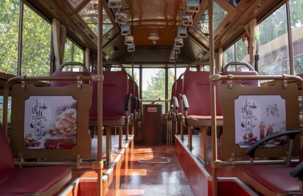 車身外形與眾不同,車內(nèi)文化也極具特色。交發(fā)集團以“一車一主題”為原則,打造了工業(yè)歷史、旅游景點、特色美食、戲曲文化等多個主題文化車廂。利用燈箱、擋板、拉手等車內(nèi)設(shè)施,以圖文并茂的形式介紹唐山文化,串起唐山百余年發(fā)展的歷史脈絡(luò)。鐺鐺車成為了傳遞歷史文化的“流動課堂”,整個車廂營造出濃厚的特色文化氛圍。